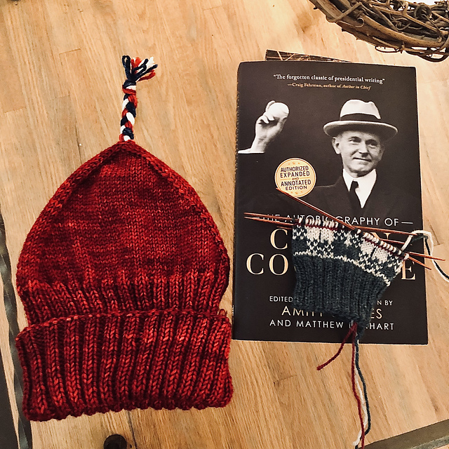 For Valentine's Day, I am hoping to have a pair of slipper socks finished for Rich, and he has asked for a resistance hat with a red, white, and blue tassel to represent our country - he is a veteran and says his oath to protect the Constitution from enemies, foreign and domestic, never expires - and I am working on a surprise project you can see up there, too.