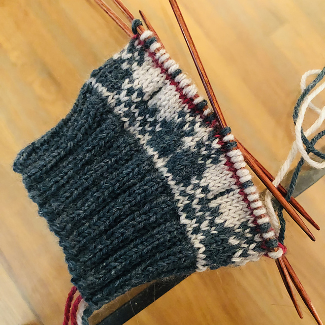 After not qualifying for two years in a row, and not even trying last year, I am in again for Sock Madness this year. My goal is to make it as a cheerleader, because then I can modify the patterns as I wish. However, first I have to finish at least one sock. I basically forgot how to read a chart today, and started reading it from the top. The sock is back on track now, and I am happy with the pattern. Most of it is straight forward sock knitting and stranded color work, but there is an interesting heel that will need attention, and the vertical red stripes in the design (which are not there yet) are made by using surface crochet.